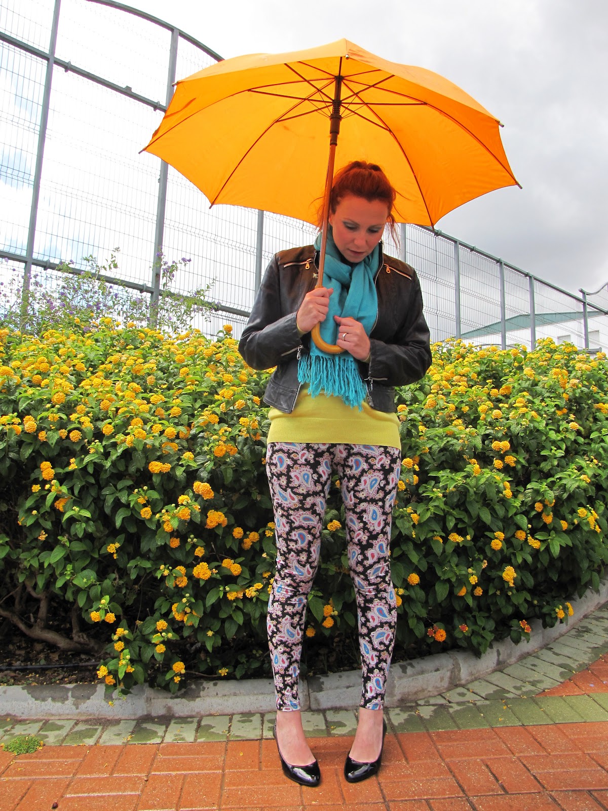 Obviando lo del paraguas amarillo; ya que es naranja….Si, los zapatos de tacón no son buenos con la lluvia, sobre todo por los resbalones. Pero son tan monos……Y al ser "kitten heels" (osea, con poquito tacón) pues se manejan bastante bien.