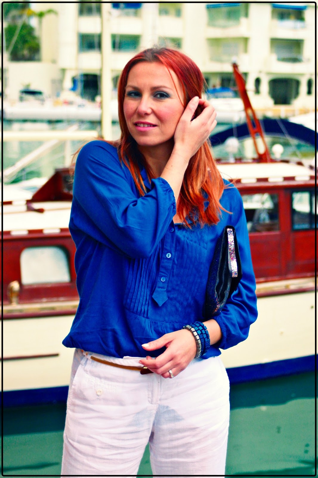 The outfit today has the colors of Andalusia. The pure white of their people and the deep blue of the sea. To announce that spring is here, I premiered my glitter clutch. Who said that glitters are nocturnal? Take out to the sun that will start flashing.