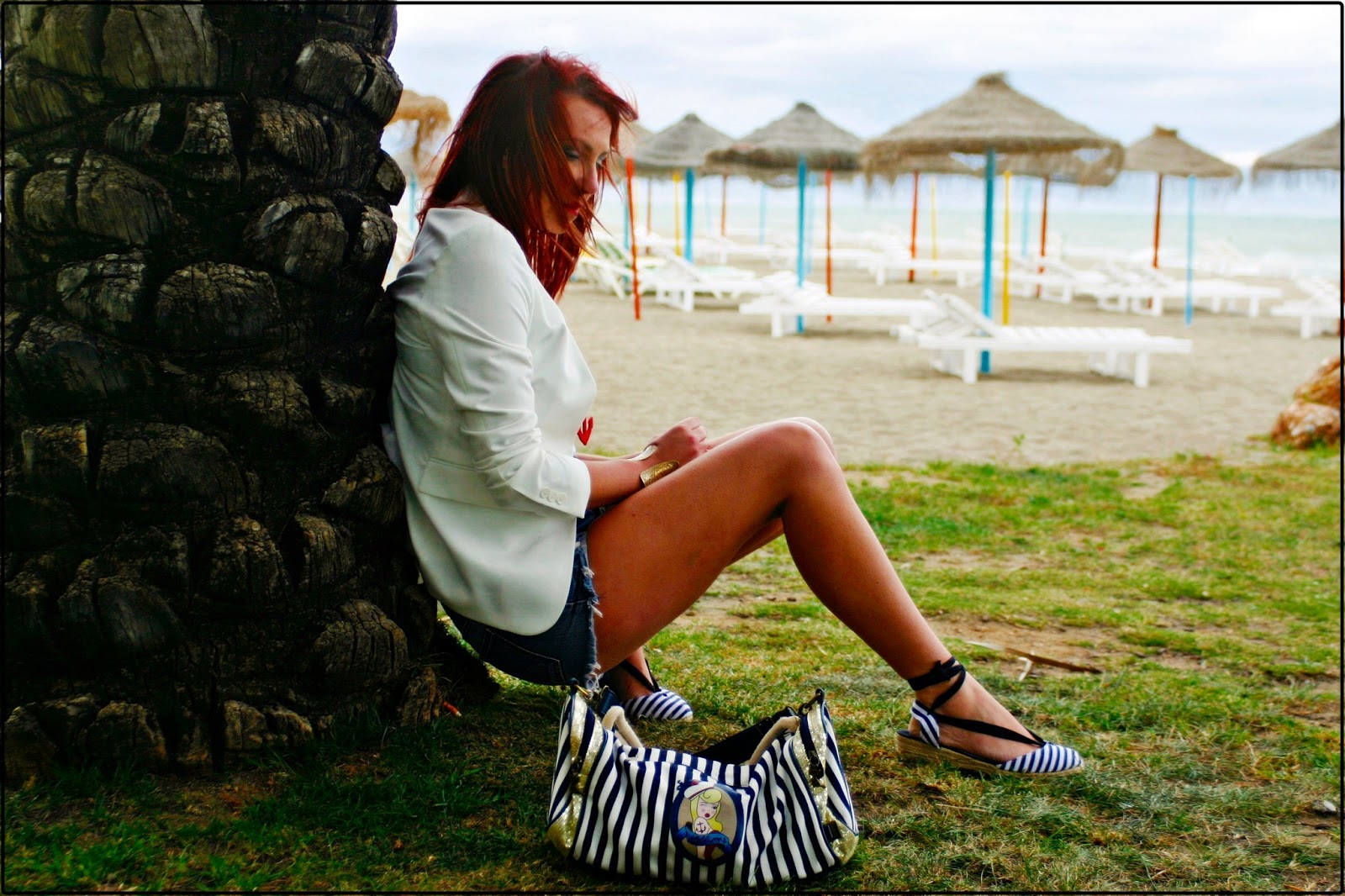 Fijaos que mi look es totalmente inspirador, porque está compuesto de básicos. con un short, una camiseta de rayas y un blazer en blanco, tienes un atuendo con un rollo «navy» que me encanta. Si no tienes blazer blanco puedes llevar una chaqueta vaquera por ejemplo. No hace falta que el pantalón sea tan corto, si no con la longitud que te encuentres cómoda. Eso si; los complementos y los labios, deben ir en rojo.